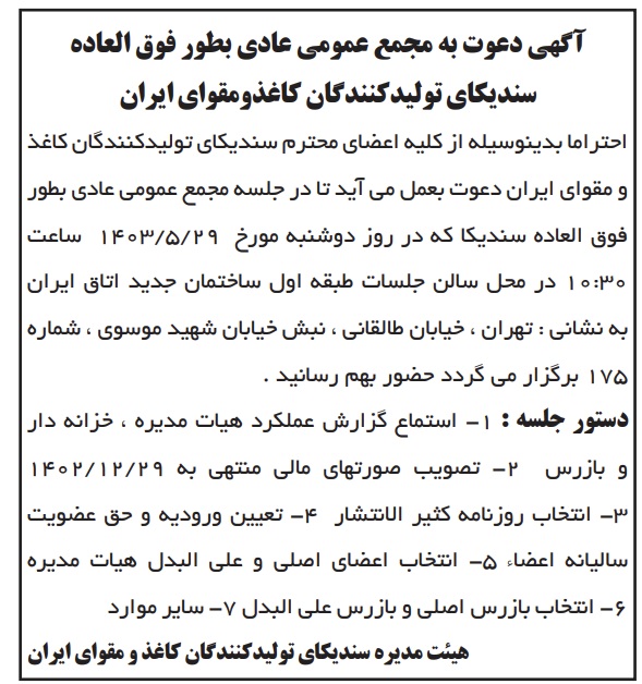 احتراما مطابق آگهی چاپ شده در مورخ ۱ مردادماه جاری در صفحه ۶ روزنامه ابرار ،بدینوسیله از کلیه اعضای محترم سندیکای تولید کنندگان کاغذ و مقوای ایران دعوت بعمل می آید تا در جلسه مجمع عمومی عادی به طور فوق العاده سندیکا که در روز دوشنبه مورخ ۱۴۰۳/۰۵/۲۹ ساعت ۱۰:۳۰ در محل سالن جلسات طبقه اول ساختمان جدید اتاق ایران به نشانی تهران، خیابان طالقانی، نبش خیابان شهید موسوی، شماره ۱۷۵ برگزار میگردد حضور بهم رسانند.